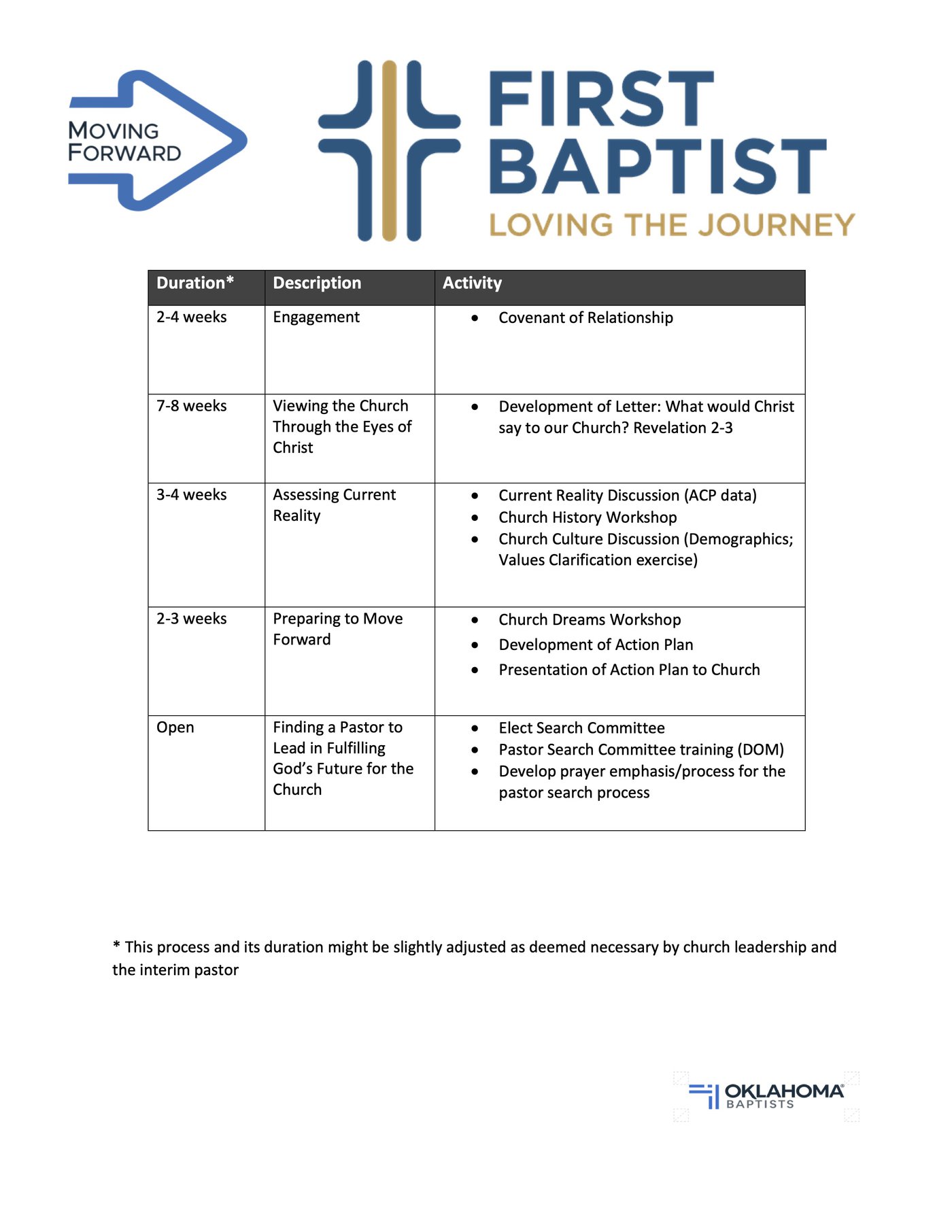 The biggest difference between a Moving Forward Interim and a Traditional Interim is the amount of time taken in establishing a Pastoral Search Committee. The work of the Moving Forward Team and the resulting report will serve both the Pastoral Search Committee and potential pastoral candidates as to how the Lord is leading First Baptist Ada to move forward. The length of the Moving Forward Process varies from church to church but generally takes 12 to 16 weeks to complete. However, the Pastoral Search Committee can usually be elected within 9 to 12 weeks once the process begins. My experience has shown that these weeks of intentional spiritual work by the church results in greater unity and heightened expectation in the calling of the next pastor. Until we meet, please know that I have been and will continue to pray for you!